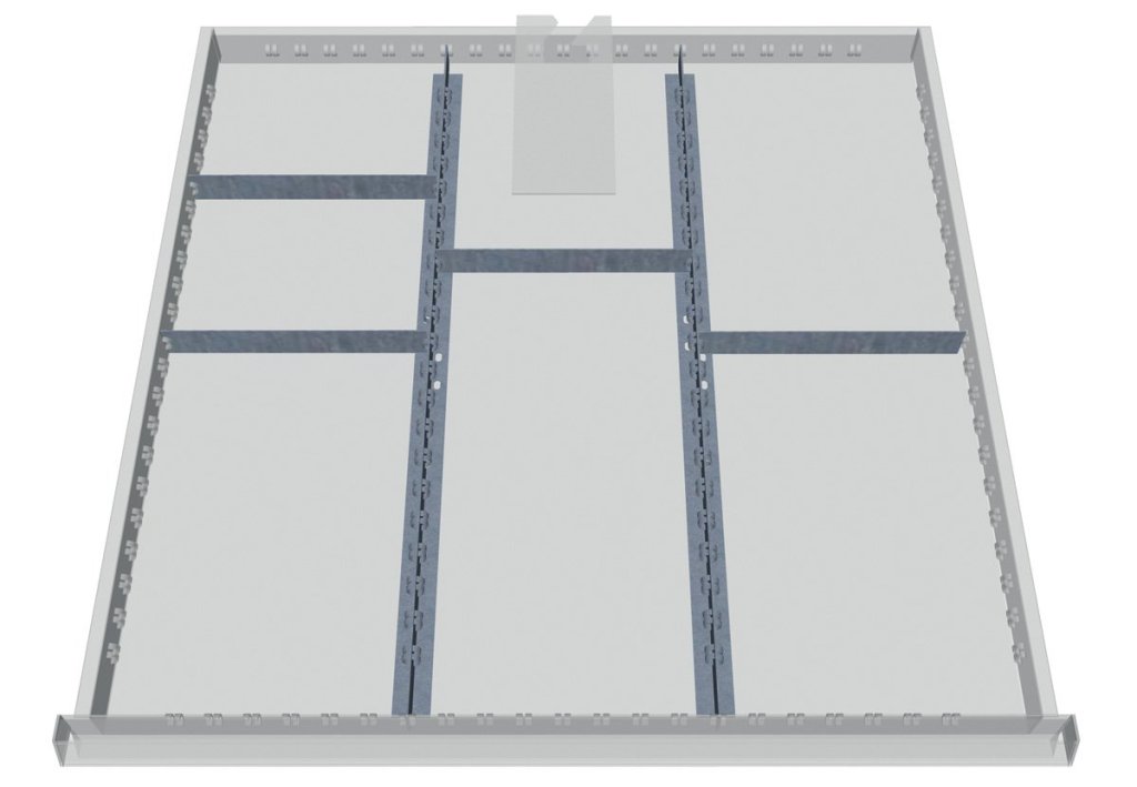 Kovové dělení do zásuvek výšky 100 mm. Vhodné pouze do zásuvkových skříní firmy Bedrunka+Hirth šířky 705 a hloubky 736 mm.