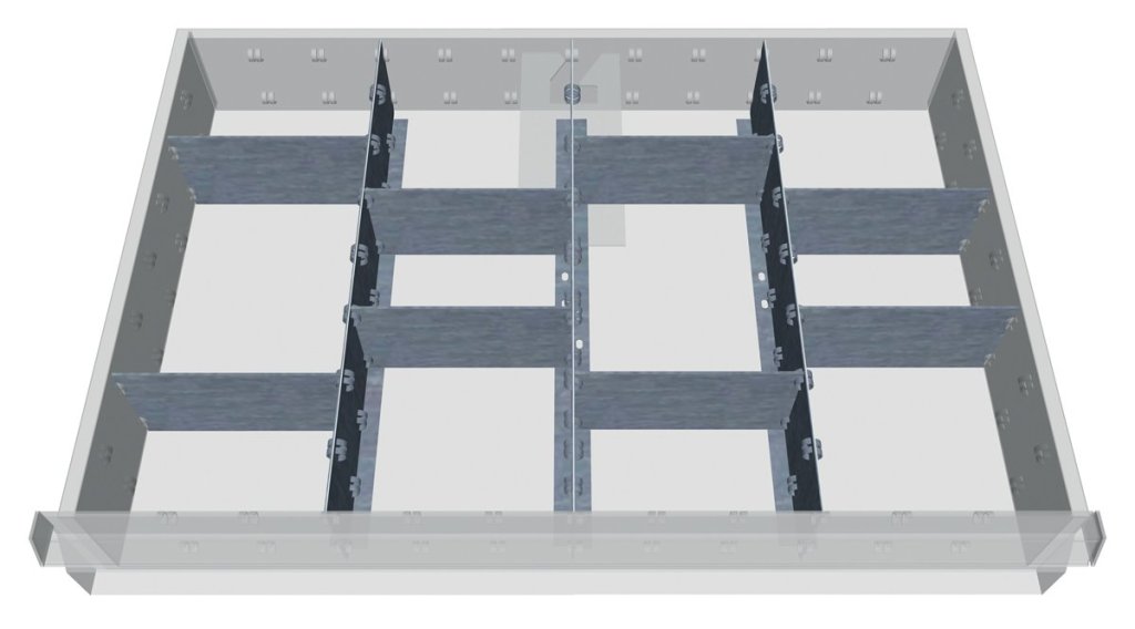 Kovové dělení do zásuvek výšky 100 mm. Vhodné pouze do servisních vozíků firmy Bedrunka+Hirth šířky 680 a hloubky 500 mm.