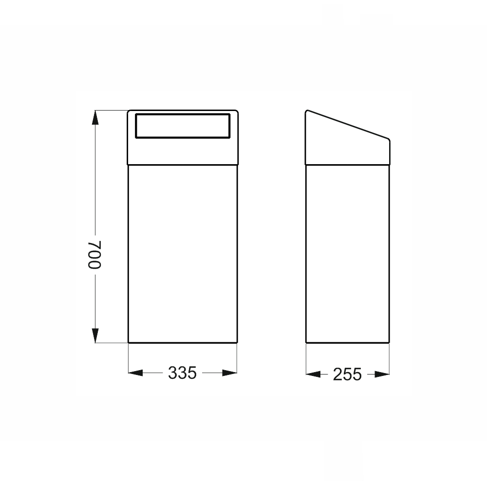 Kovová nádoba na tříděný odpad v různých barvách. Výška 700 x šířka 335 x hloubka 255 mm. Samozavírací vhazovací klapka, odnímatelné víko. Pro PE pytle o obsahu 50 l.