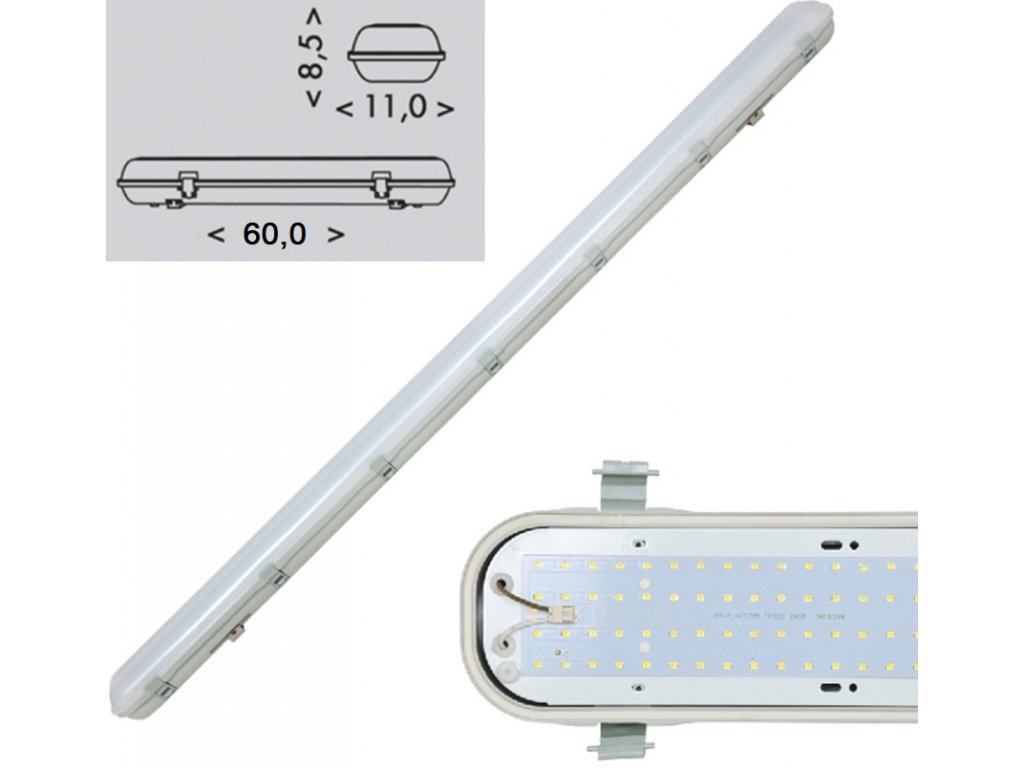 Kvalitní zářivkové světlo s výkonem 20W. Perfektní pro venkovní osvětlení a místo klasických zářivek. Těleso je prachotěsné a voděodolné, hodí se i do náročných průmyslových podmínek. Chromatičnost 4100 K, napájení 230 V. Rozměry 105 x 600 x 135 mm, hmotnost 1,25 kg.
