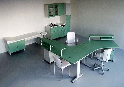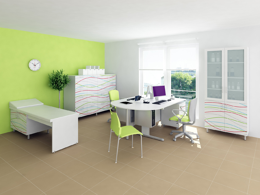 Lékařský nábytek PRAKTIK 2 lze doplnit stolovou řadou kancelářského nábytku PROFIL Stoly se vyrábí s rektifikovatelnými kovovými nebo plnými deskovými podnožemi.