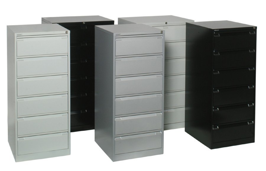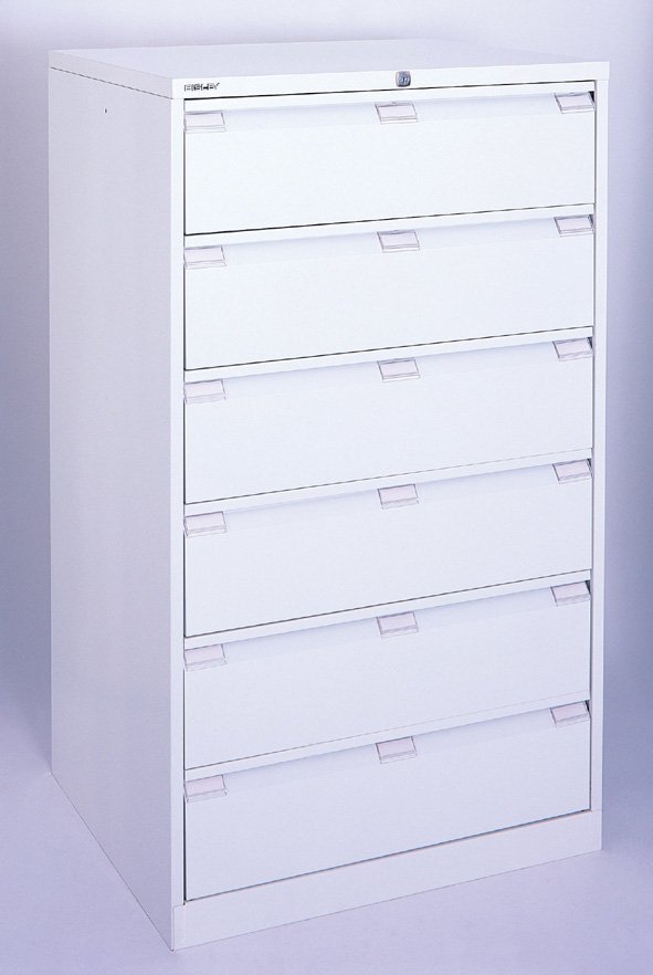 Šestizásuvkové kovové kartotéky na obálky formátu A5 (archivovaný doklad může mít šířku až 235 mm), celková šířka 568, výška 1321, hloubka 622 mm, různé barvy. V barvě světle šedé RAL 7035 skladem.