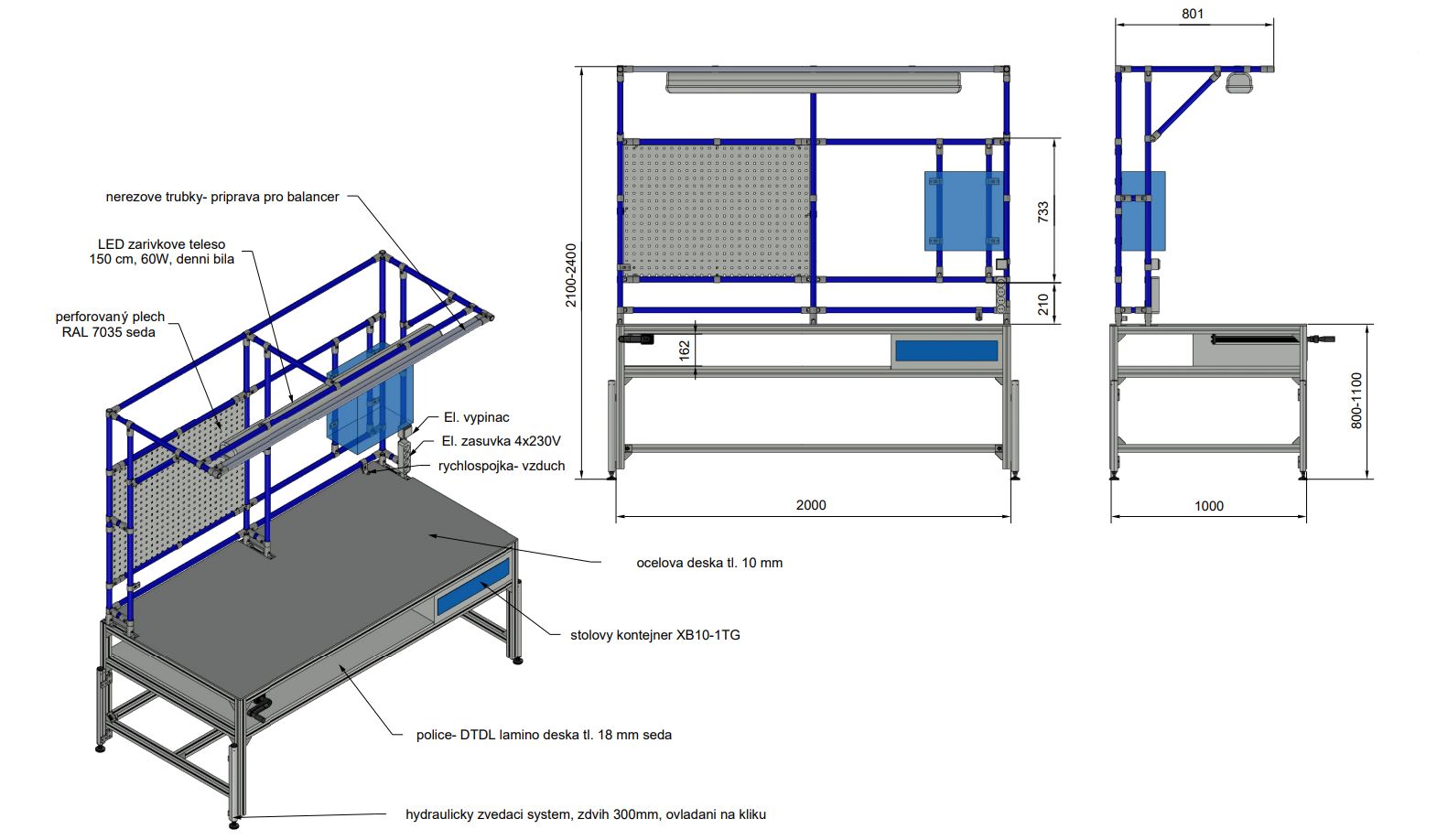 Výškově nastavitelný dílenský stůl na svařování z hlinikových profilů s nástavbou z trubkového systému je odolné a flexibilní celý popis a parametry