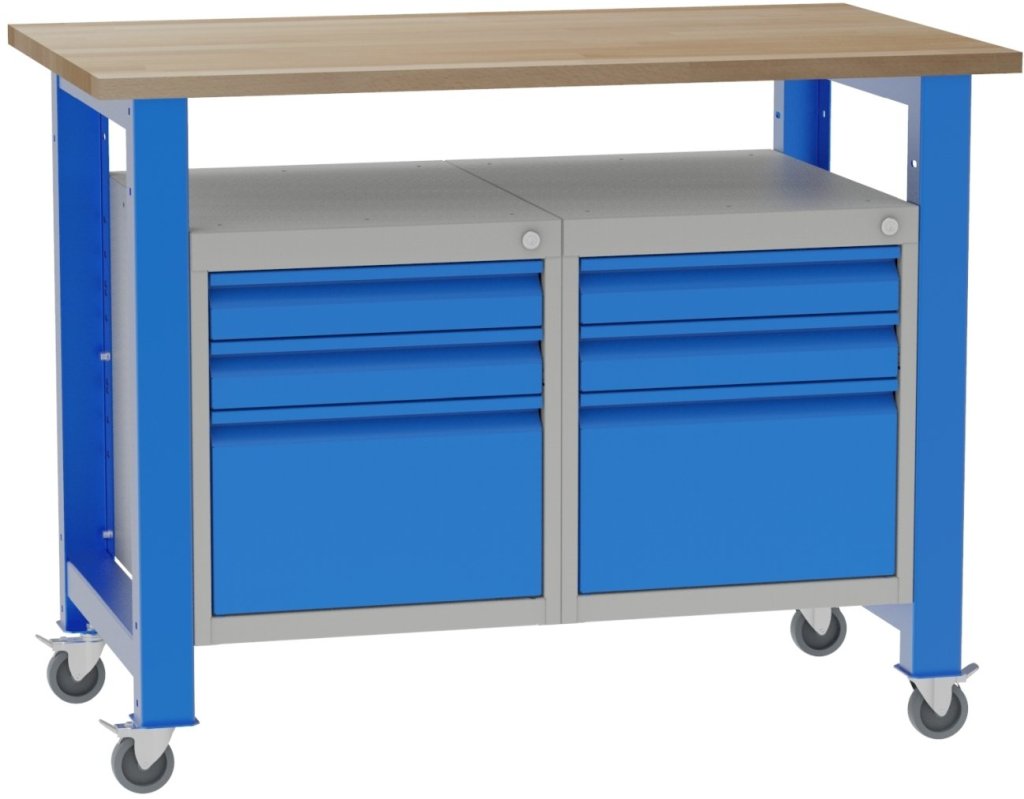 Pracovní deska 27/40 mm vodovzdorná buková spárovka. Noha výška 800, šířka 1200, hloubka 700 mm. Vložený kontejner výška 527, šířka 480, hloubka 610 mm. Stůl má nosnost 500/1000 kg, výšku 928/941, šířku 1200, hloubku 700 mm, barva nohy modrá RAL 5012, barva kontejneru šedá RAL 7035/modrá RAL 5012.