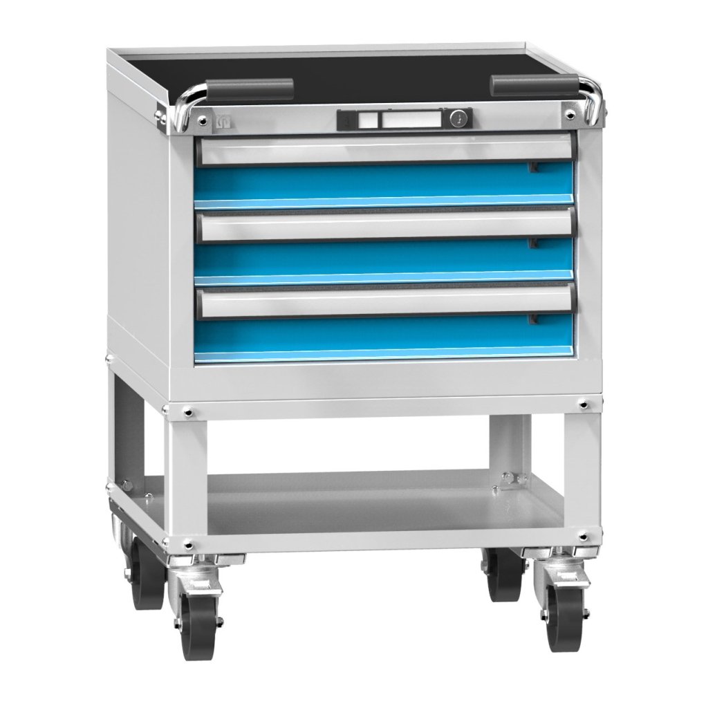 Mobilní kontejner, výška 808, šířka 1037, hloubka 630 mm. 3x zásuvka, 2x 160 mm polypropylen kolečka pevná, 2x 160 mm polypropylen kolečka otočná s brzdou, zvýšená hrana 20 mm + gumová podložka, pevná madla. Vnitřní rozměr zásuvky 918 x 459 mm.