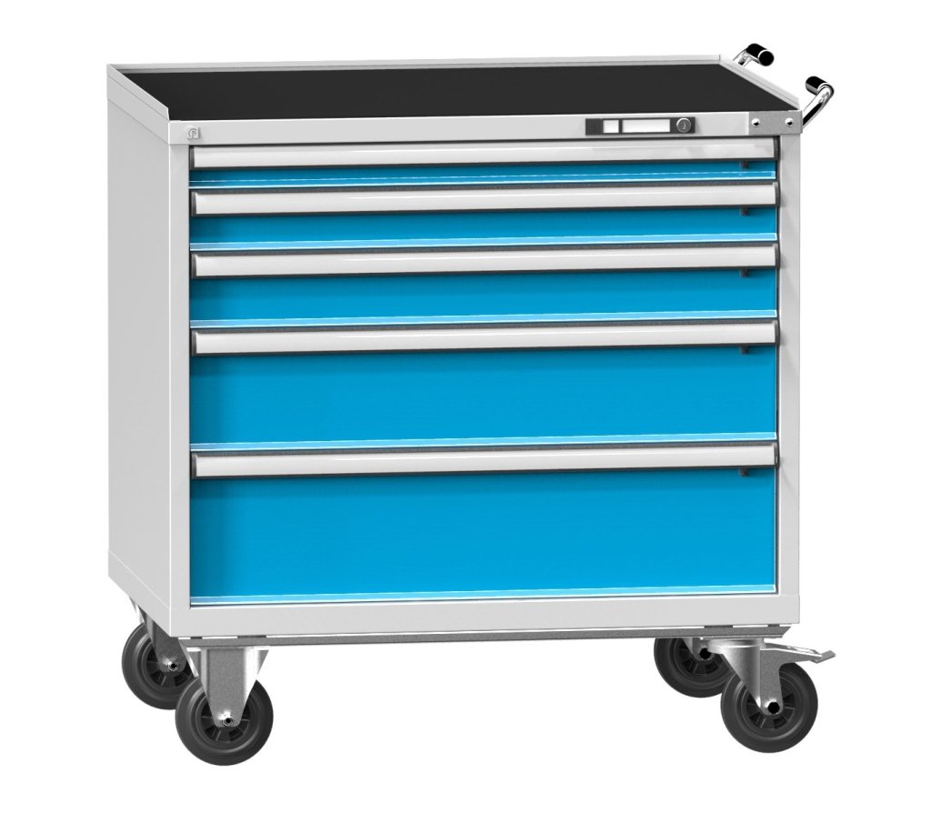 Mobilní kontejner, výška 1058, šířka 1037, hloubka 780 mm. 5x zásuvka, 2x 160 mm polypropylen kolečka pevná, 2x 160 mm polypropylen kolečka otočná s brzdou, zvýšená hrana 20 mm + gumová podložka, pevná madla. Vnitřní rozměr zásuvky 918 x 612 mm.