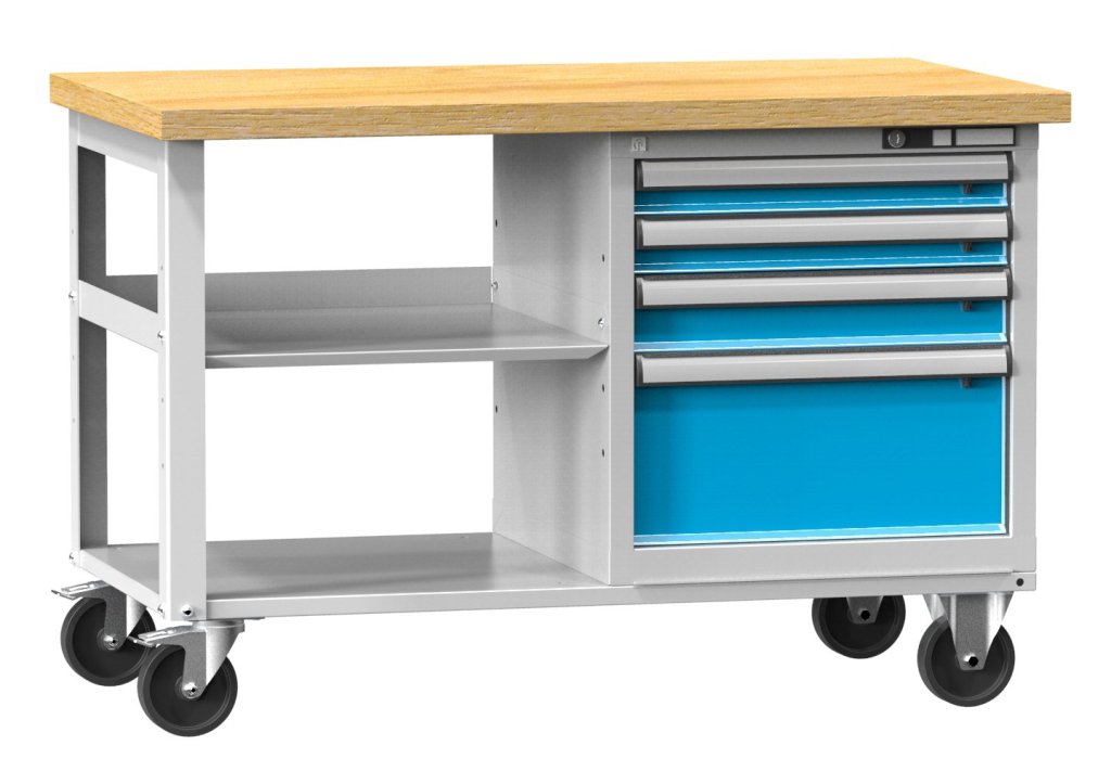 Mobilní pracovní stůl, pracovní deska 1200 x 700 x 40 mm, výška stolu 810 mm. Pracovní deska buk multiplex (označení M - vrstvená buková dýha) - tloušťka 40 mm nebo spárovka buk tloušťky 40 mm. Nosnost stolu 380 kg.