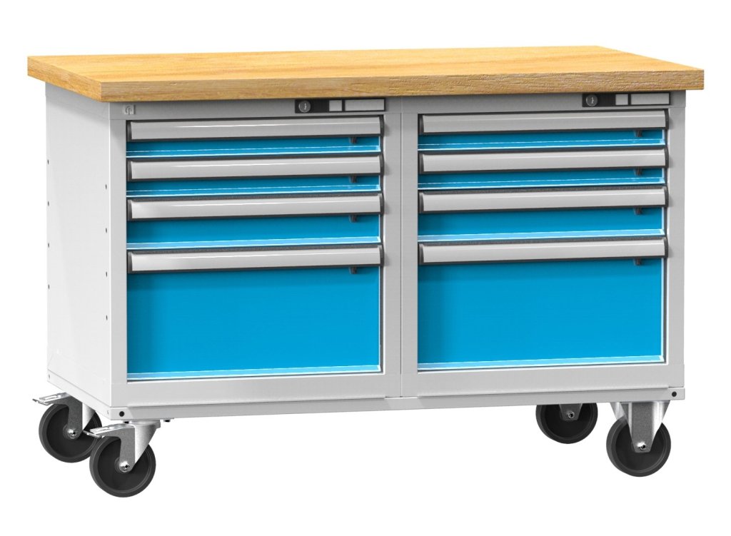 Mobilní pracovní stůl, pracovní deska 1200 x 700 x 40 mm, výška stolu 810 mm. Pracovní deska buk multiplex (označení M - vrstvená buková dýha) - tloušťka 40 mm nebo spárovka buk tloušťky 40 mm. Nosnost stolu 380 kg.
