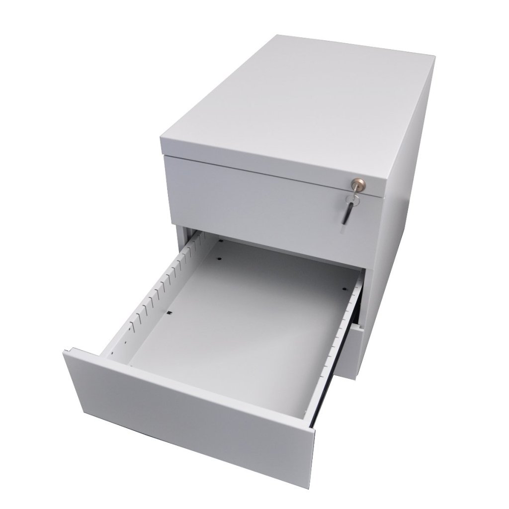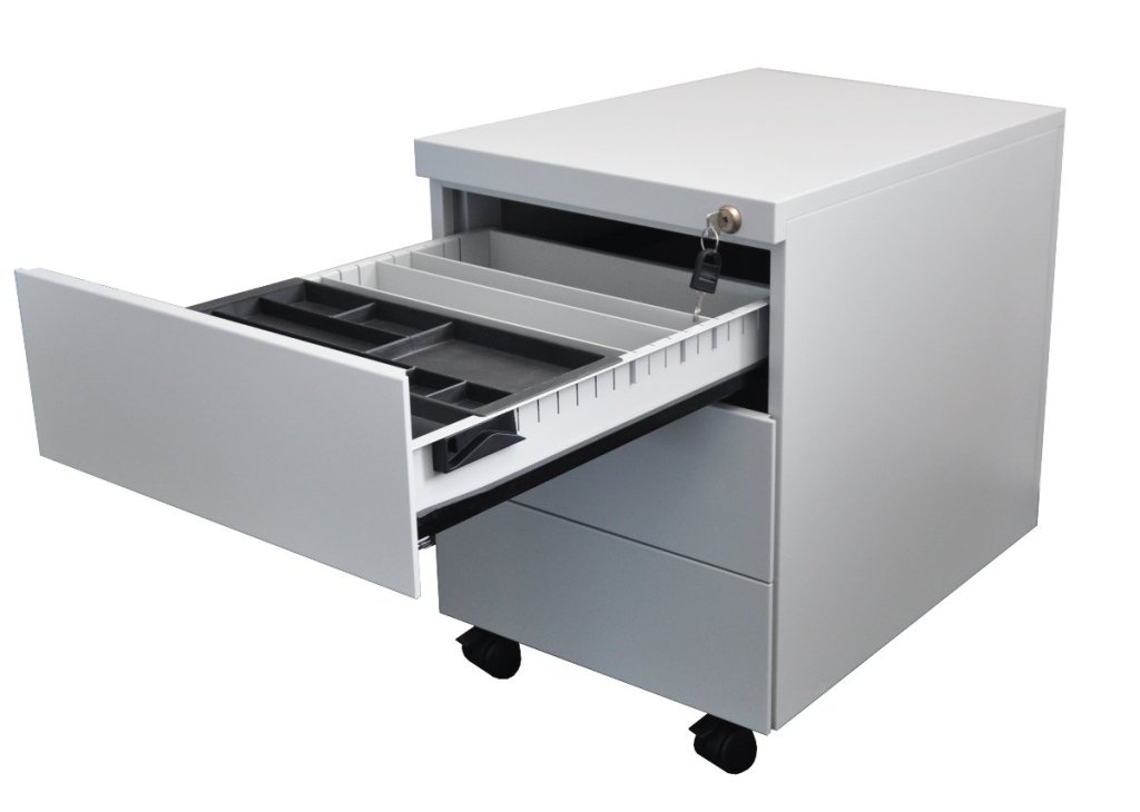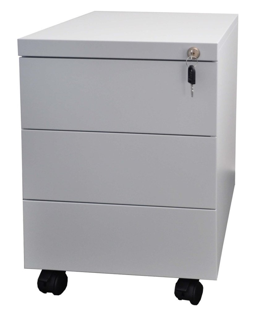 Mobilní třízásuvkový kontejner z ocelového plechu tloušťky 0,6 mm. Výška 505 x šířka 390 x hloubka 590 mm, centrální zámek. celý popis a parametry