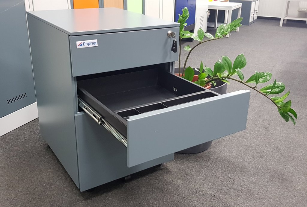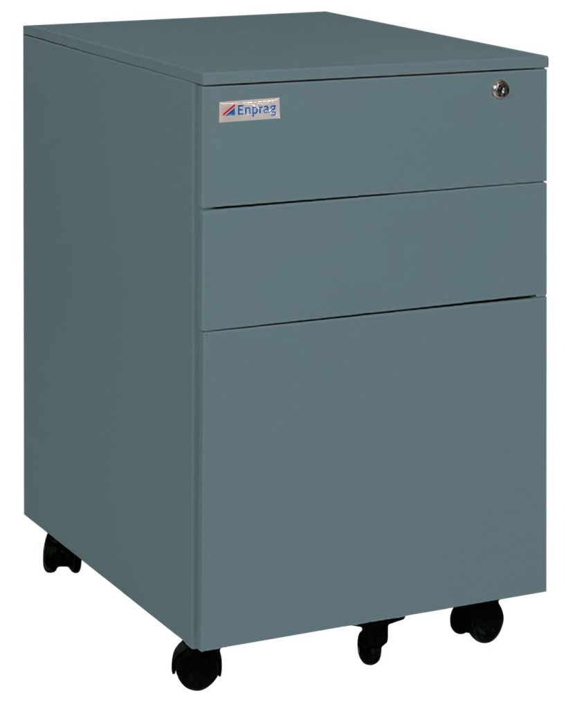 Mobilní třízásuvkový kontejner z ocelového plechu tloušťky 0,6 mm. Výška 643 x šířka 405 x hloubka 500 mm, centrální zámek. Povrchová úprava šedou práškovou barvou RAL 7047.
