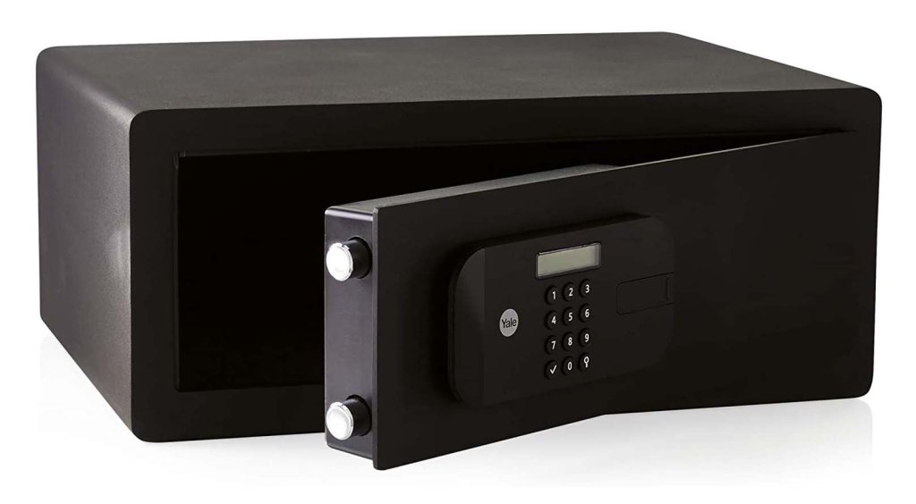 Nábytkový sejf Yale Guest Laptop, zamykání na elektronický kód, modře podsvícený displej, pákový oboustranný systém zamykání. Výška 200 x šířka 430 x hloubka 350 mm, vnitřní rozměry 197 x 427 x 287 mm, vhodný pro laptop.