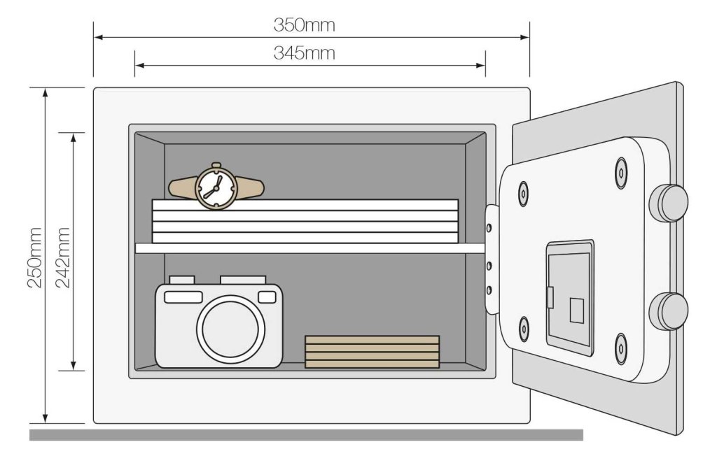 Nábytkový sejf Yale Value Medium, zamykání na elektronický kód, bez displeje, pákový oboustranný systém zamykání. Výška 250 x šířka 350 x hloubka 250 mm, vnitřní rozměry 240 x 340 x 200 mm.