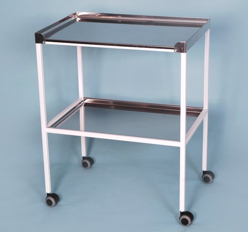 Nástrojový pojízdný stolek typ 47620a. Nástrojový stolek s nerez deskou se skládá z kovové konstrukce, která je povrchově upravená práškovou technologií. Horní a spodní odkládací deska nerez.