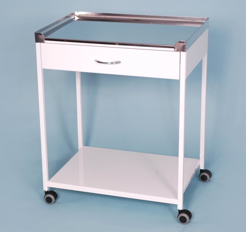 Nástrojový pojízdný stolek typ 47628. Nástrojový stolek s nerez deskou a zásuvkou se skládá z kovové konstrukce, která je povrchově upravená práškovou technologií. Horní deska je antikorová a spodní odkládací deska je z ocelového plechu.