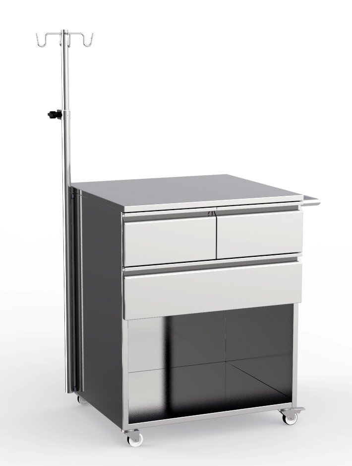 Příruční stolek pojízdný. Kovová konstrukce je z jeklu, povrchově upravená práškovou technologií. Skládá se ze tří políc s obrubou, na horní polici je rukověť umožňující snadnou manipulaci. Výplň polic tvoří bílý akrylon, nosnost police je 50 kg.