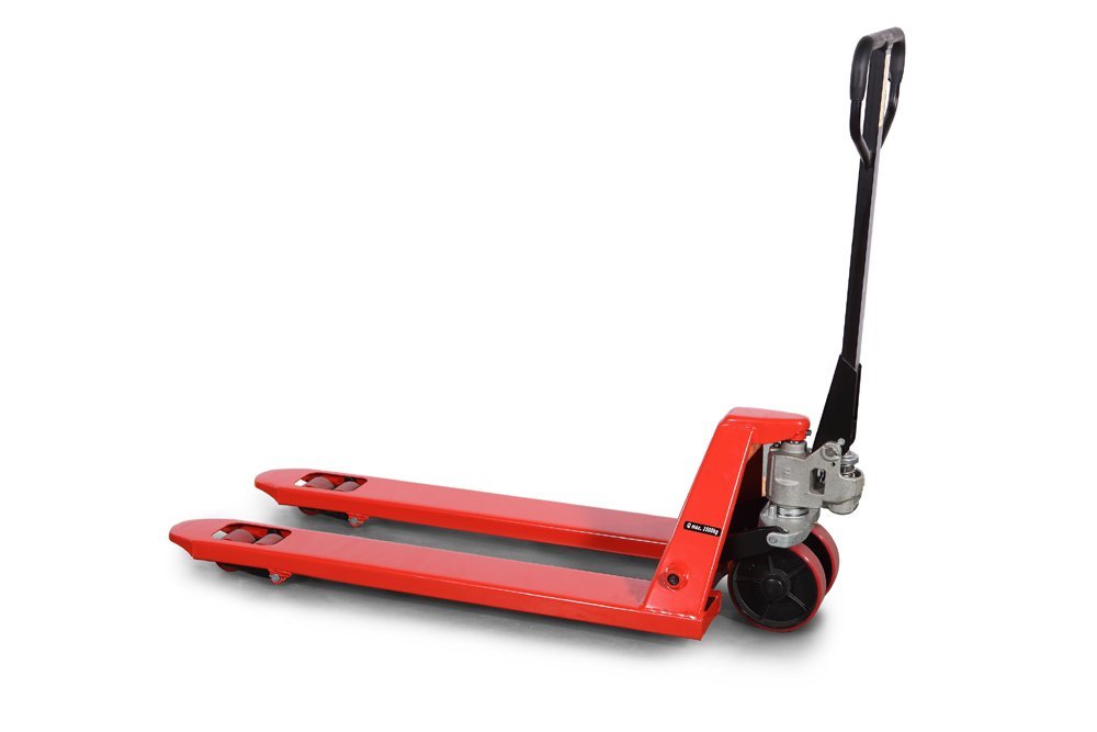 Ruční paletový vozík, rozměry výška 1230 x šířka 540 x hloubka 1540 mm, nosnost 2500 kg, šířka vidlic 540 mm, délka vidlic 1150 mm.
