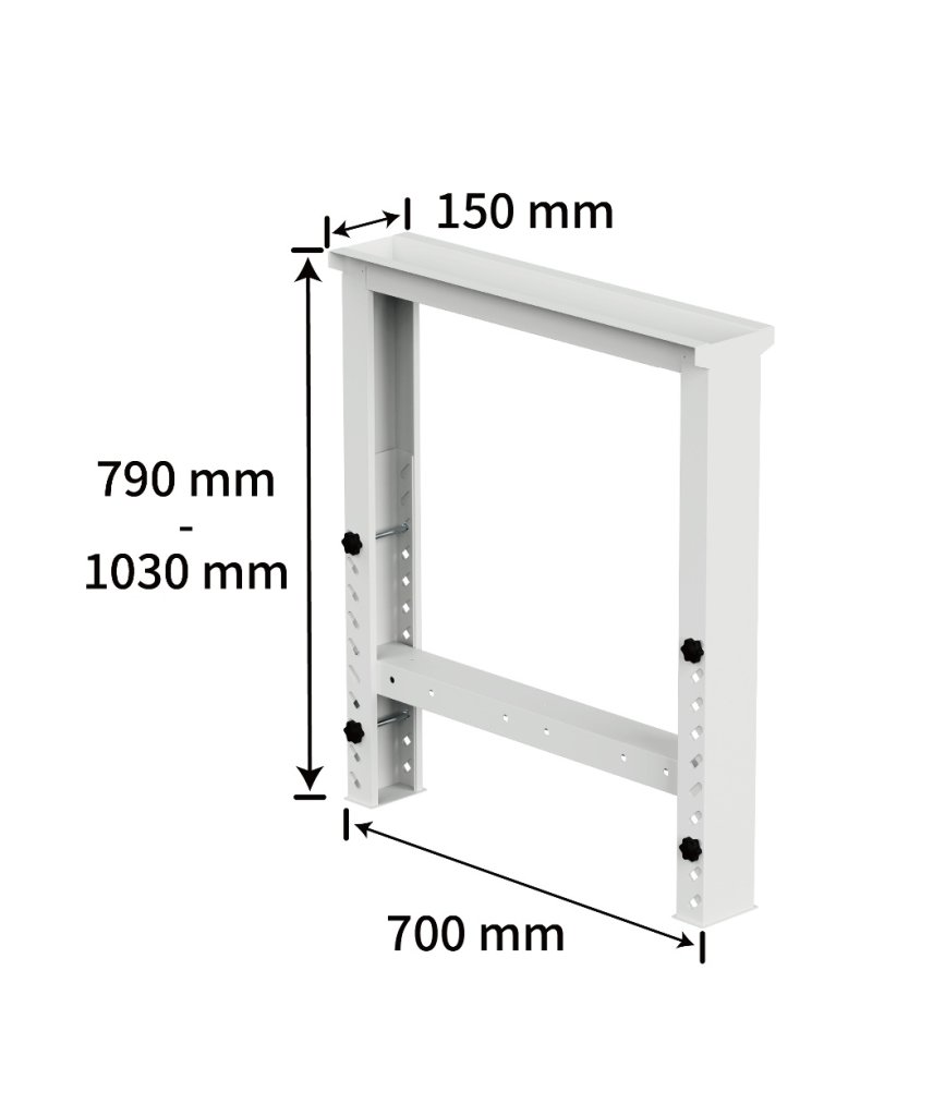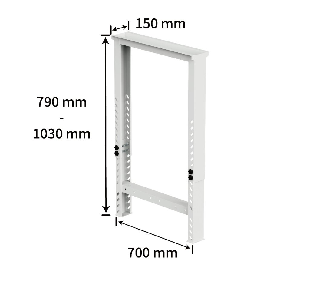 Výškově přestavitelné provedení nohy typ HDZ-T02, výška 790 - 1030 mm, šířka 150 mm, hloubka 699 mm, barva světle šedá RAL 7035.