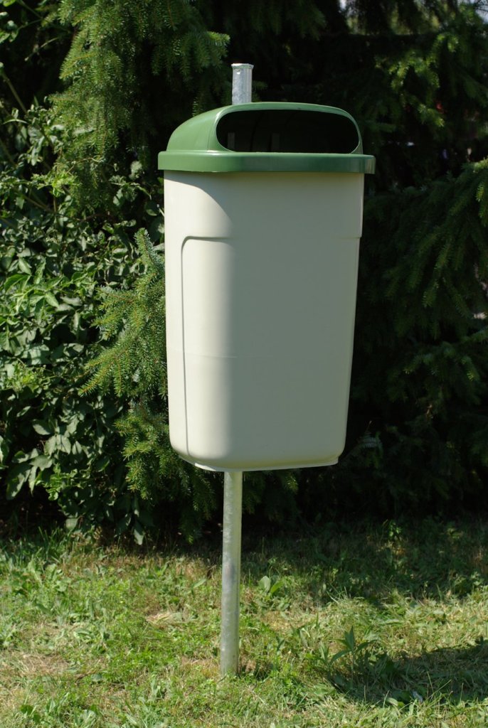 Velice rozšířený a oblíbený koš v celé Evropě. Jednoduchá manipulace pro vyprazdňování nádob pomocí manipulační kličky. Nerezová ploška pro zhášení cigaretových nedopalků. 100% recyklovatelný materiál z PE, barvostálé. Možnost upevnění koše na kovový sloupek nebo na zeď. Obsah 50 l.