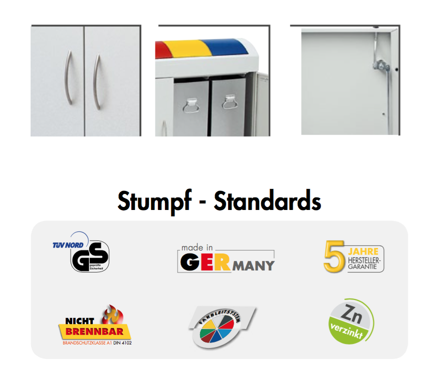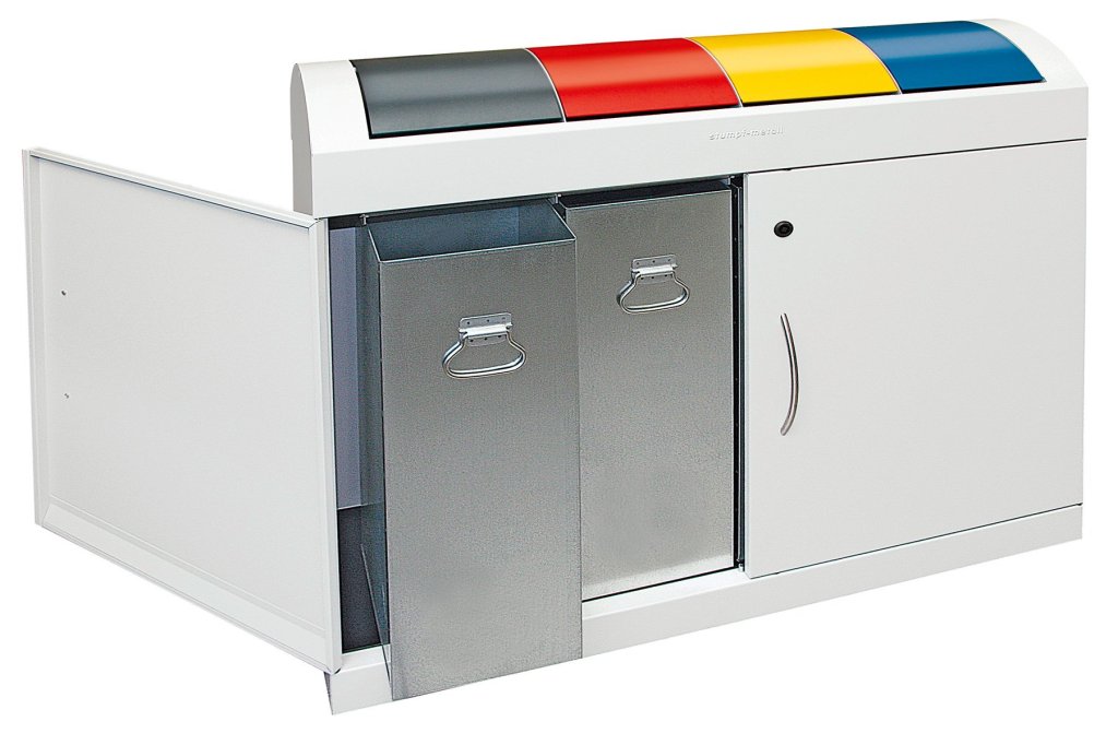 Kovový odpadkový koš o rozměrech - výška 1000 x šířka 1210 x hloubka 300 mm. Celá konstrukce má pozinkovaný povrch. Zavírání má robustní chrániče ve 3 barvách pro rozlišení. Klapky jsou neustále otevřené - lze vhodit odpad bez dotyku s košem. Koš má uzamykatelné dveře v přední části a vyjímatelné vnitřní koše 3x 45 l. Dvě nastavitelné nohy pro vyrovnání nerovností podlahy. Piktogramy nejsou součástí dodávky.