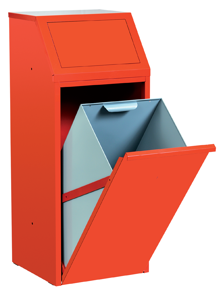Kovový odpadkový koš vhodný na tříděný odpad. Výška 970 x šířka 380 x hloubka 335 mm, objem 100 l. Barva koše světle šedá RAL 7035, různé barvy víka pro rozlišení druhu odpadu. Pouze pro vnitřní použití.