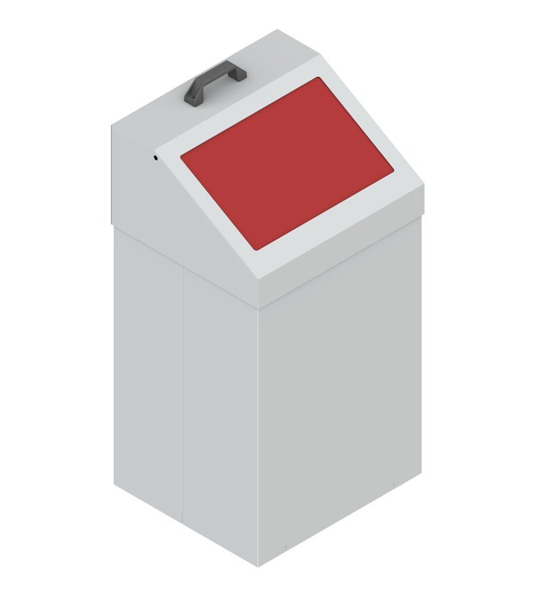 Kovový odpadkový koš vhodný na tříděný odpad. Výška 970 x šířka 380 x hloubka 335 mm, objem 100 l. Barva koše světle šedá RAL 7035, různé barvy víka pro rozlišení druhu odpadu. Pouze pro vnitřní použití.