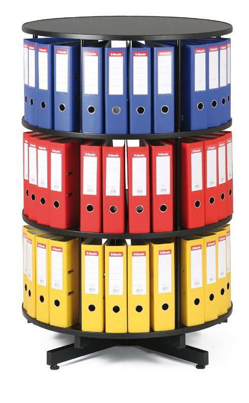 Otočná archivační skříň - karusel. Výška 1270 mm, průměr 800 mm, 3 patra, kapacita šanonů 72. Provedení světle šedá. celý popis a parametry