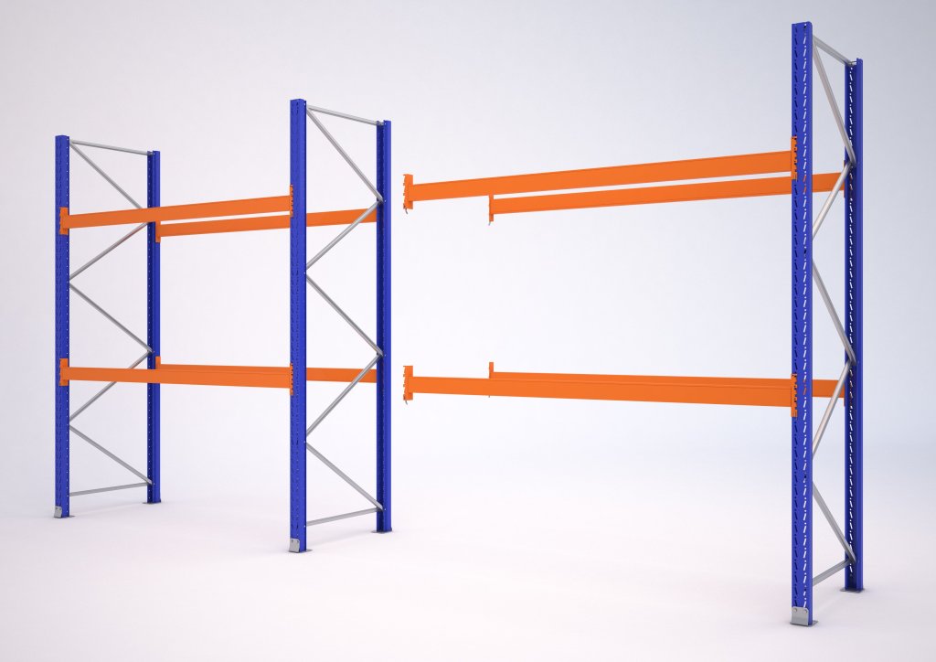 Paletový regál přístavný. Nosnost 900 kg na 1 paletu, výška 3366 mm, šířka 2700, hloubka 1100 mm, počet úrovní nosníků 2. Lakované stojny v barvě modrá RAL 5010, nosníky barva oranžová RAL 2004. Pouze jedna stojina - slouží k nastavování základních regálů. U těchto výrobků doprava i s hodnotou nákupu nad 3.000,- Kč bez DPH hrazena dle místa dodání. Osobní odběr v Chrudimi.