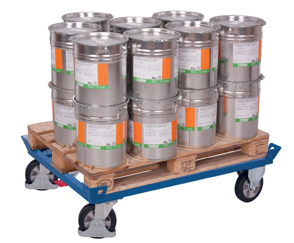 Vozíky o různých rozměrech pro Euro palety nebo klecové palety. Konstrukce z oceli. V každém rohu zarážka pro zachycení palety. Prášková barva RAL 5010 enciánová modrá. Kvalitní odolná termoplastická kola s kuličkovým ložiskem. Nosnost vozíku 500 kg.