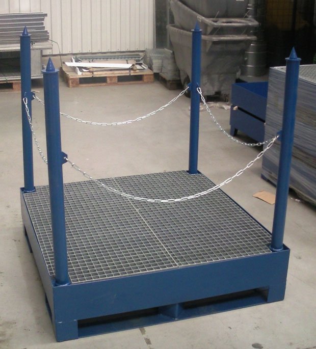 Palety slouží pro bezpečné skladování a transport kapalin, které škodí životnímu prostředí. Vhodné pouze do budov nebo pod přístřešek. Povrchová úprava: lakovaná barva RAL 5010. Rozměry v. 1300 x š. 1200 x hl. 600 mm. Záruka 2 roky.