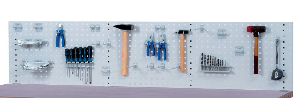 Perfopanel k zavěšování držáků nářadí k dílenský stolům a deskám šířky 1000 - 1200 mm. Šířka panelu 1000, výška 450 mm.
