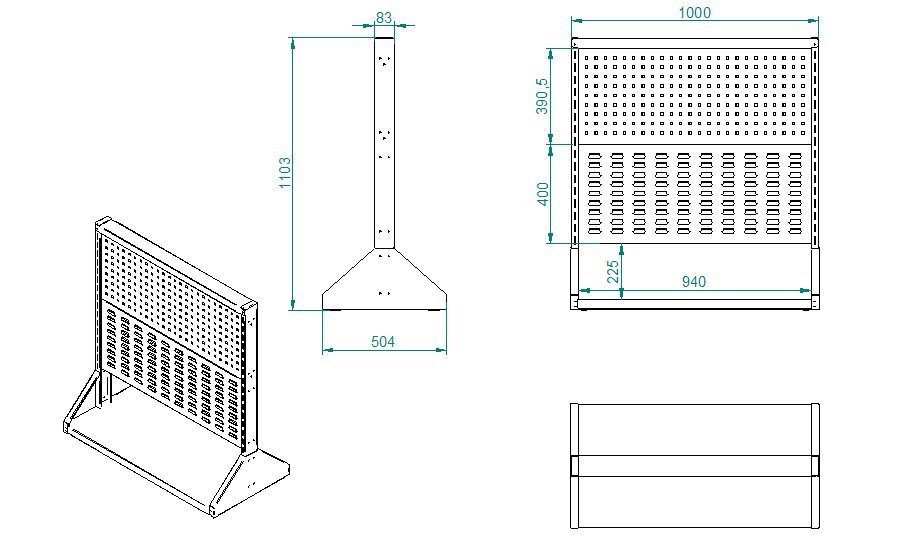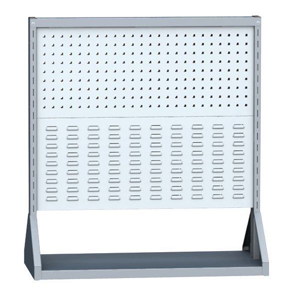 Pevný oboustranný perfostojan pro 4 panely. Slouží pro zavěšení nářadí a plastových boxů. Celkové rozměry stojanu v mm (V x Š x H) 1103 x 1000 x 504.
