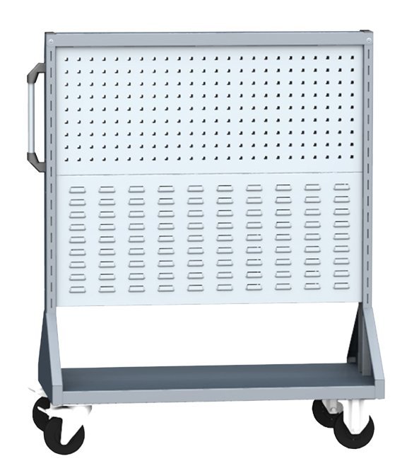 Pojízdný oboustranný perfostojan pro 4 panely. Slouží pro zavěšení nářadí a plastových boxů. Celkové rozměry stojanu v mm (V x Š x H) 1257 x 1055 x 504.