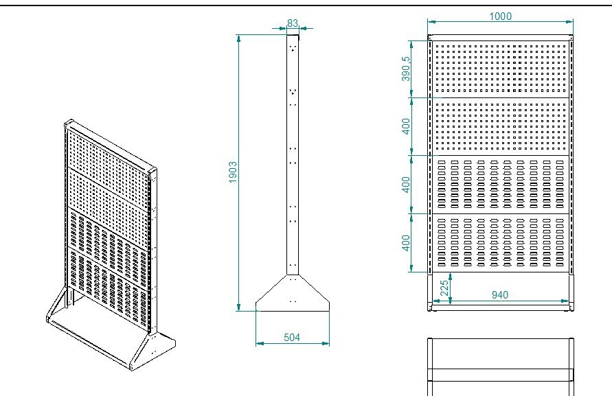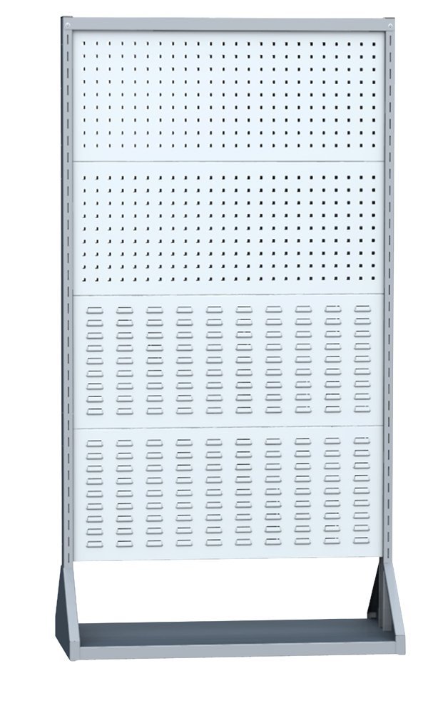 Pevný oboustranný perfostojan pro 8 panelů. Slouží pro zavěšení nářadí a plastových boxů. Celkové rozměry stojanu v mm (V x Š x H) 1903 x 1000 x 504.