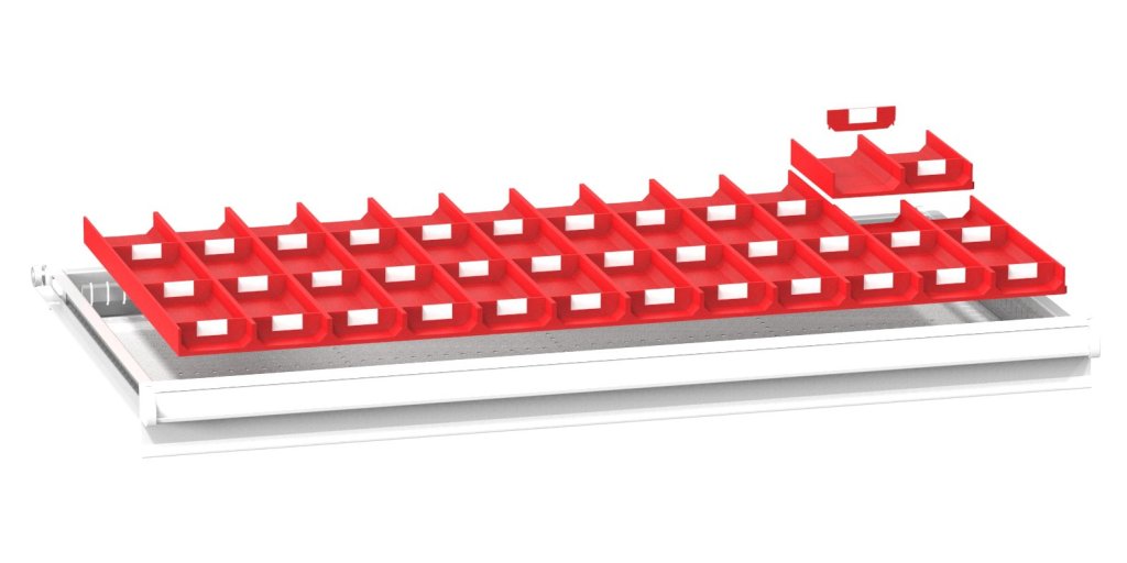 Plastové dělení zásuvek skříněk série ZC, 18x čtyřdílný žlab, šířka žlabu 33 mm, 72x přepážka, hmotnost 2,3 kg.