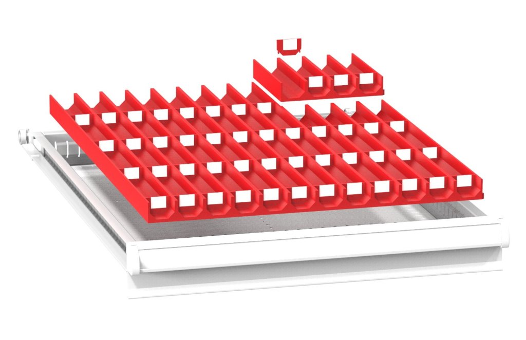 Plastové dělení zásuvek skříněk série ZE, 12x čtyřdílný žlab, šířka žlabu 33 mm, 48x přepážka, hmotnost 1,5 kg.