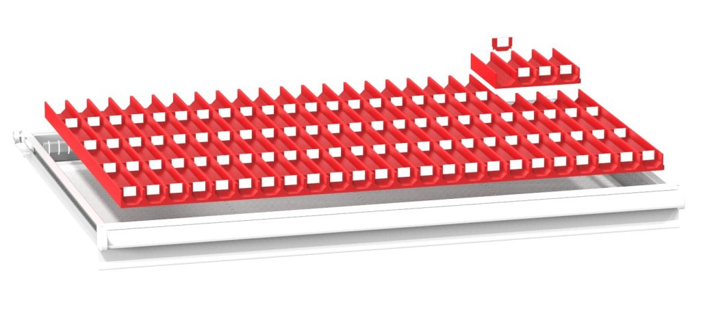 Plastové dělení zásuvek skříněk série ZG, 24x třídílný žlab, šířka žlabu 45 mm, 72x přepážka, hmotnost 2,6 kg.