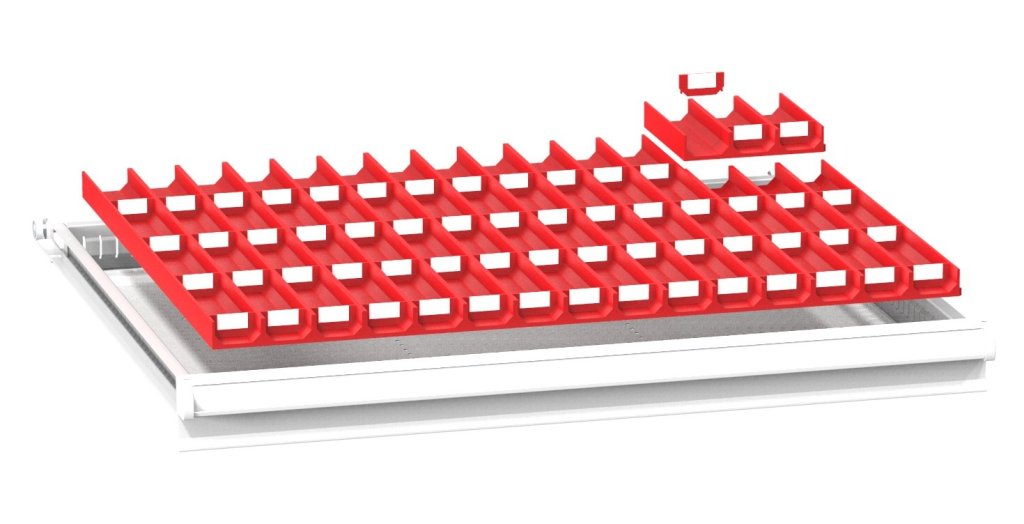 Plastové dělení zásuvek skříněk série ZK, 20x čtyřdílný žlab, šířka žlabu 33 mm, 80x přepážka, hmotnost 2,6 kg.