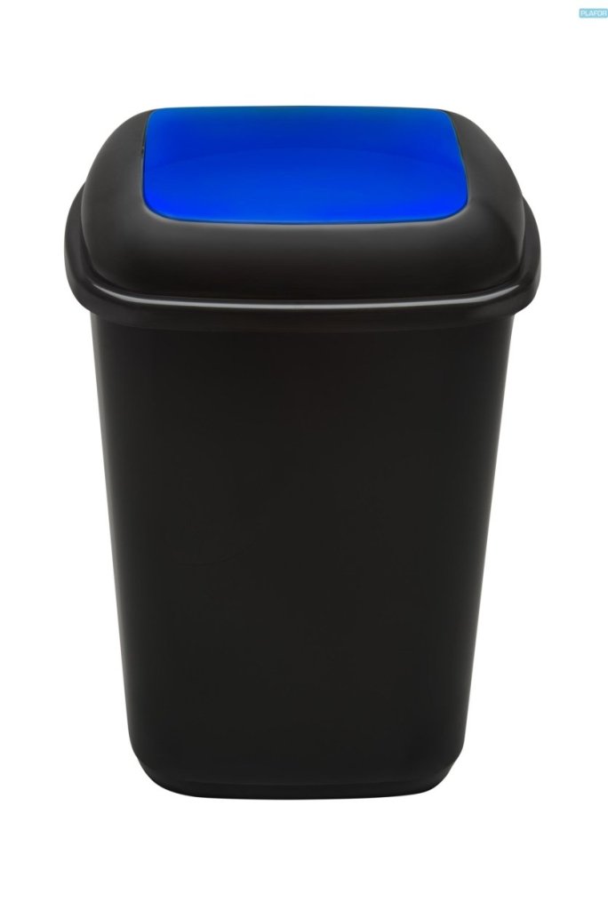 Moderní plastový odpadkový koš o objemu 90 l z černého plastu na tříděný odpad s modrou klapkou ve víku. Víko s pružinou je odnímatelné. Koš označen samolepkou (lze odlepit). Doprodej skladových zásob.
