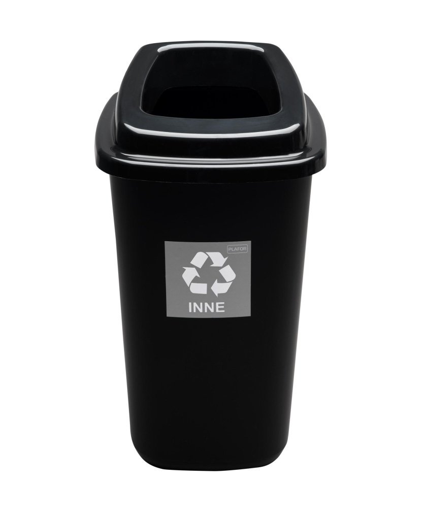 Plastový odpadkový koš o objemu 45 l z černého plastu na tříděný odpad s černým víkem. Víko s otvorem pro vhoz odpadu je odnímatelné. Koš označen samolepkou.
