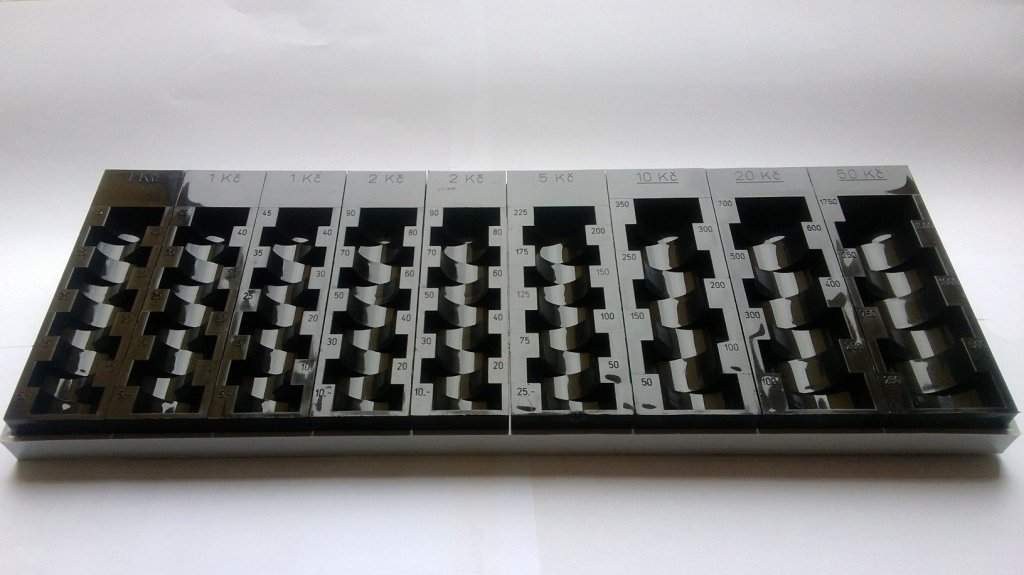 Plastový pořadač na mince Kč, šířka 325, výška 45, hloubka 120 mm. Praktická pomůcka pro všechny obchodníky, směnárny a úřady, kde celý popis a parametry