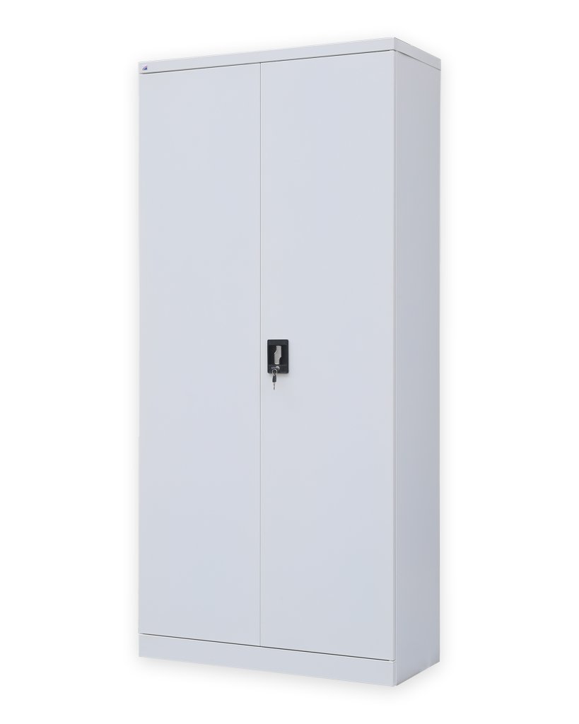 Dvoudveřová demontovaná skříň z ocelového plechu tloušťky 0,6 mm. Výška 1850 x šířka 900 x hloubka 390 mm, 4x police, cylindrický rozvorový zámek se dvěma klíči. Povrchová úprava šedou práškovou barvou RAL 7047.