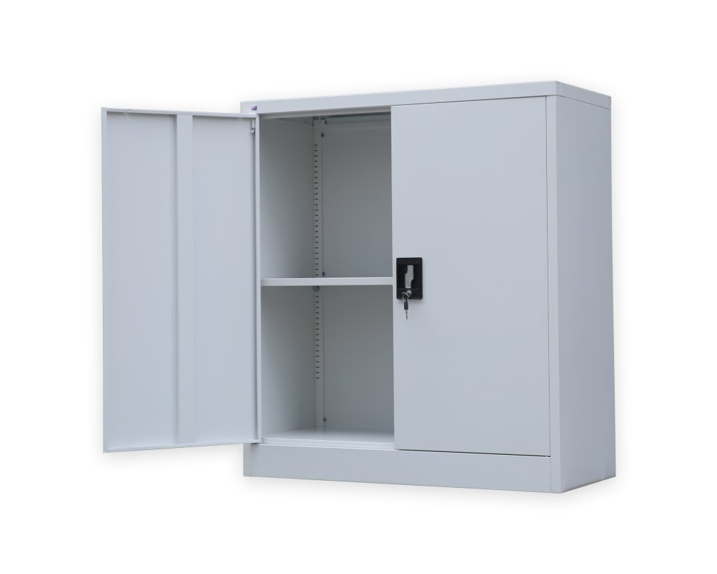 Dvoudveřová kovová skříň na šanony, 2x police, výška 1000, šířka 800, hloubka 383 mm, uzamykatelná. Barva šedá RAL 7035.
