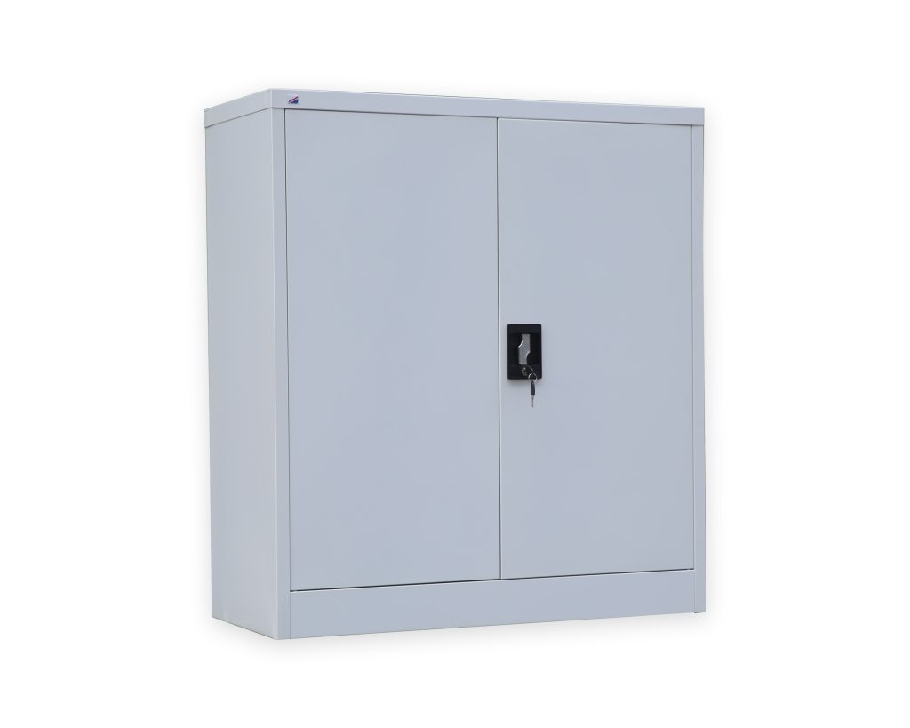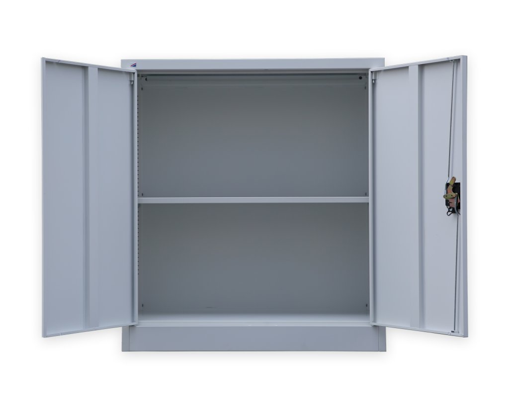 Dvoudveřová demontovaná skříň z ocelového plechu tloušťky 0,6 mm. Výška 1000 x šířka 900 x hloubka 400 mm, 1x police, cylindrický rozvorový zámek se dvěma klíči. Povrchová úprava práškovou barvou.