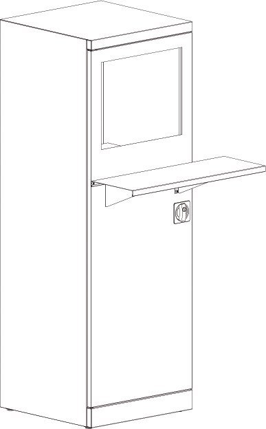 Počítačová skříň vyrobená z 0,8 mm silného ocelového plechu. 1 dveře, 1 pevná police na klávesnici a myš, prodlužovací kabel se 4 zásuvkami, ventilátor. Do skříně se umístí LCD obrazovka o velikosti do 17 palců. Rozměry v mm (V x Š x H) 1600 x 550 x 550.