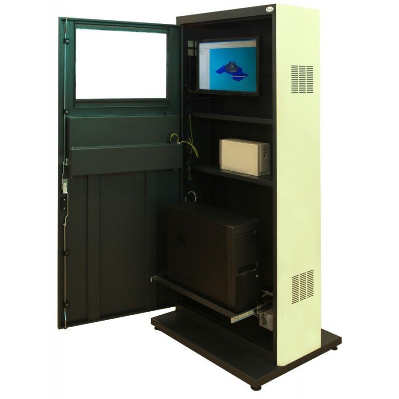 Počítačová skříň vyrobená z 0,8 mm silného ocelového plechu. 1 dveře, 1 pevná police na klávesnici a myš, prodlužovací kabel se 4 zásuvkami, ventilátor. Do skříně se umístí LCD obrazovka o velikosti do 17 palců. Rozměry v mm (V x Š x H) 1600 x 550 x 550.