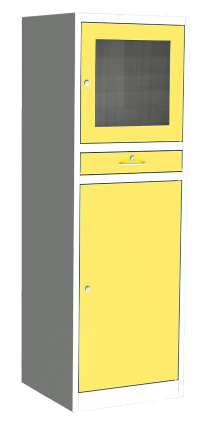 Počítačová skříň s uzamykatelnými dvířky, jednou přestavitelnou policí a výsuvnou policí pro klávesnici za sklopnými dvířky. Výška 1600 x šířka 610 x hloubka 600 mm. Barva korpusu RAL 7035 světle šedá.