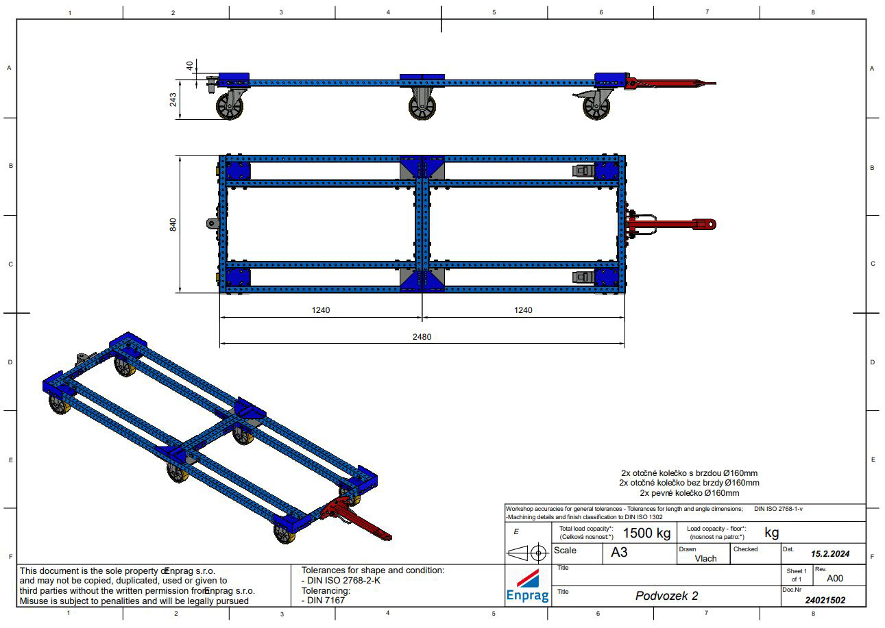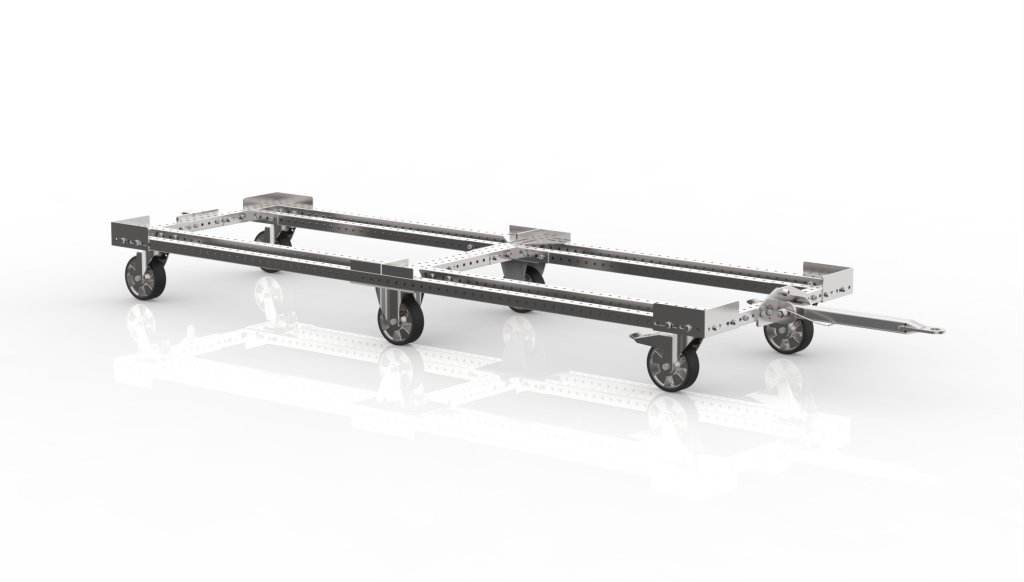 Manipulační podvozek na dvě EURO palety s ojí, která umožňuje zapojení více vozíků za sebe (tzv. Milk-run systém). Podvozek je vhodný pro různé manipulační účely ve skladech i dílnách. Díky své vysoké nosnosti 1500 kg je ideální pro přepravu těžších předmětů. Součástí podvozku jsou 2x otočná kolečka s brzdou a 2x otočná kolečka bez brzdy a 2x pevná kolečka o průměru 160 mm, která umožňují snadnou manipulaci s předměty. Rozměry podvozku 283 x 2480 x 840 mm. Možnost ESD varianty.