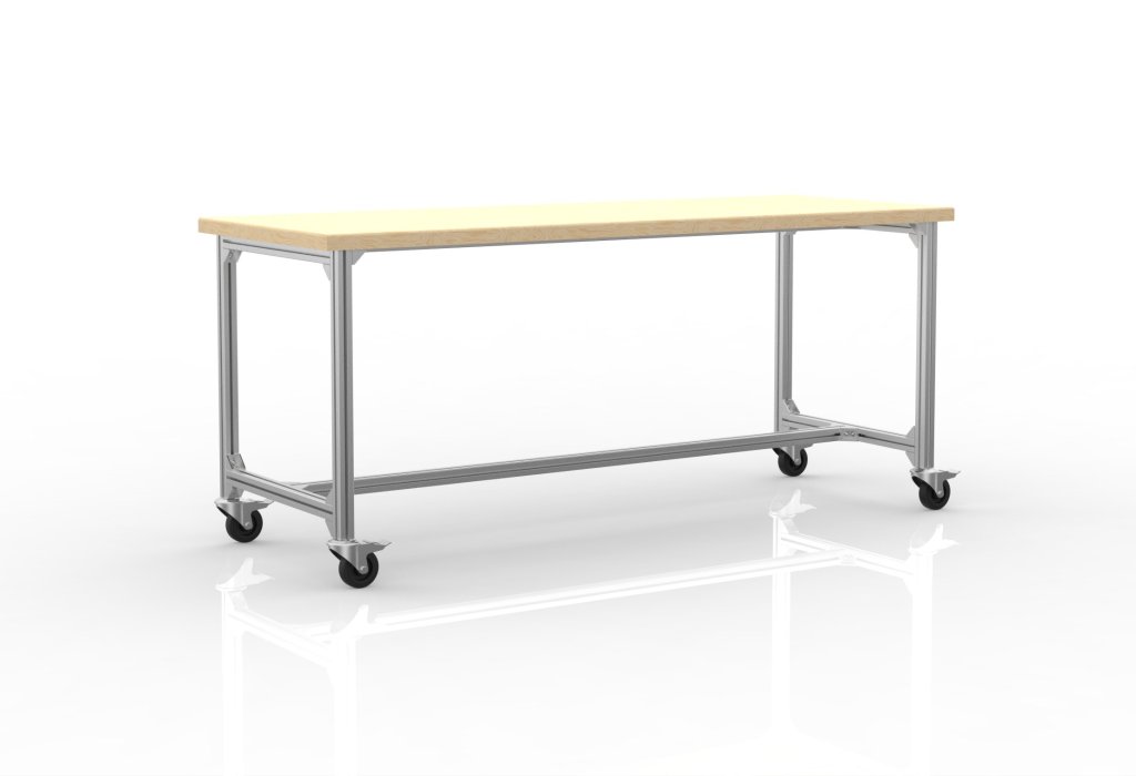 Pojízdný pracovní stůl z hliníkových profilů, díky kolečkům umožňuje snadnou manipulaci a rychlé přesunutí pracovního místa.
