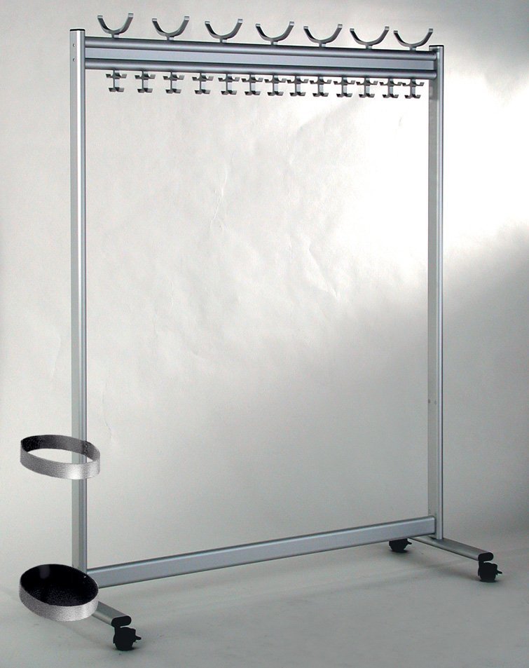 Hliníkový věšák na kolečkách. 10 háčků na klobouky, 32 háčků na kabáty. Rozměry v mm (V x Š x H) 1700 x 1000 x 400. Držák na deštníky není v ceně, můžete si ho za příplatek dokoupit.