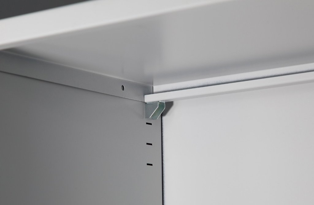 Police hladká včetně podpěrek k uchycení do skříně. Nosnost 40 kg, barva světle šedá RAL 7035. Pro skříně šířky 1200 mm. Další celý popis a parametry